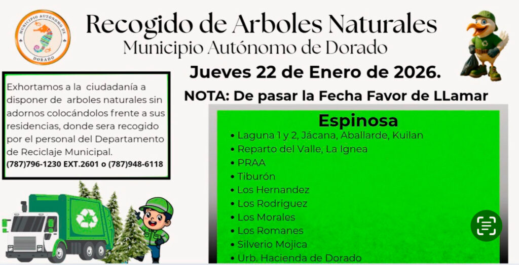 El servicio de recogido de basura en el municipio de Dorado se lleva a cabo los martes, sin un horario específico. Para evitar retrasos o que queden sin recoger, se recomienda colocar los zafacones la noche anterior.