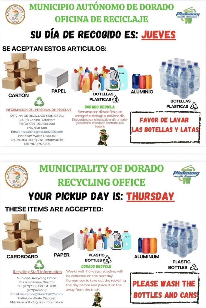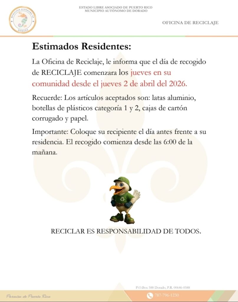 Por este medio les informamos que, según notificación recibida de la ♻️Oficina de Reciclaje del Municipio de Dorado, el día de recogido de reciclaje en nuestra comunidad será los jueves, comenzando el _jueves 2 de abril de 2026.